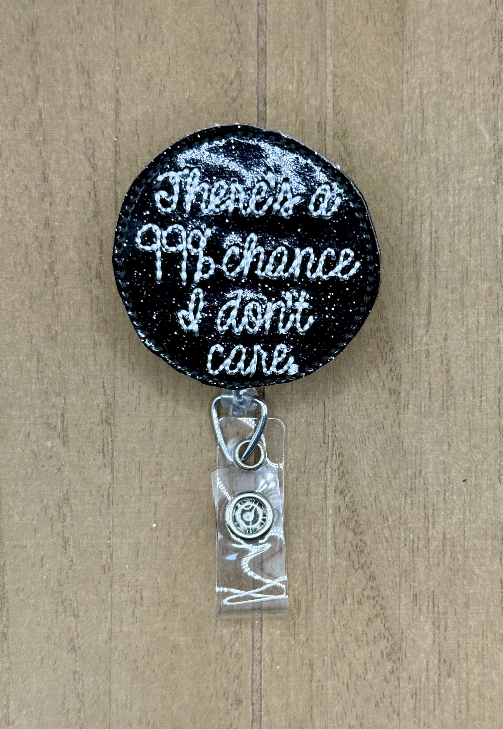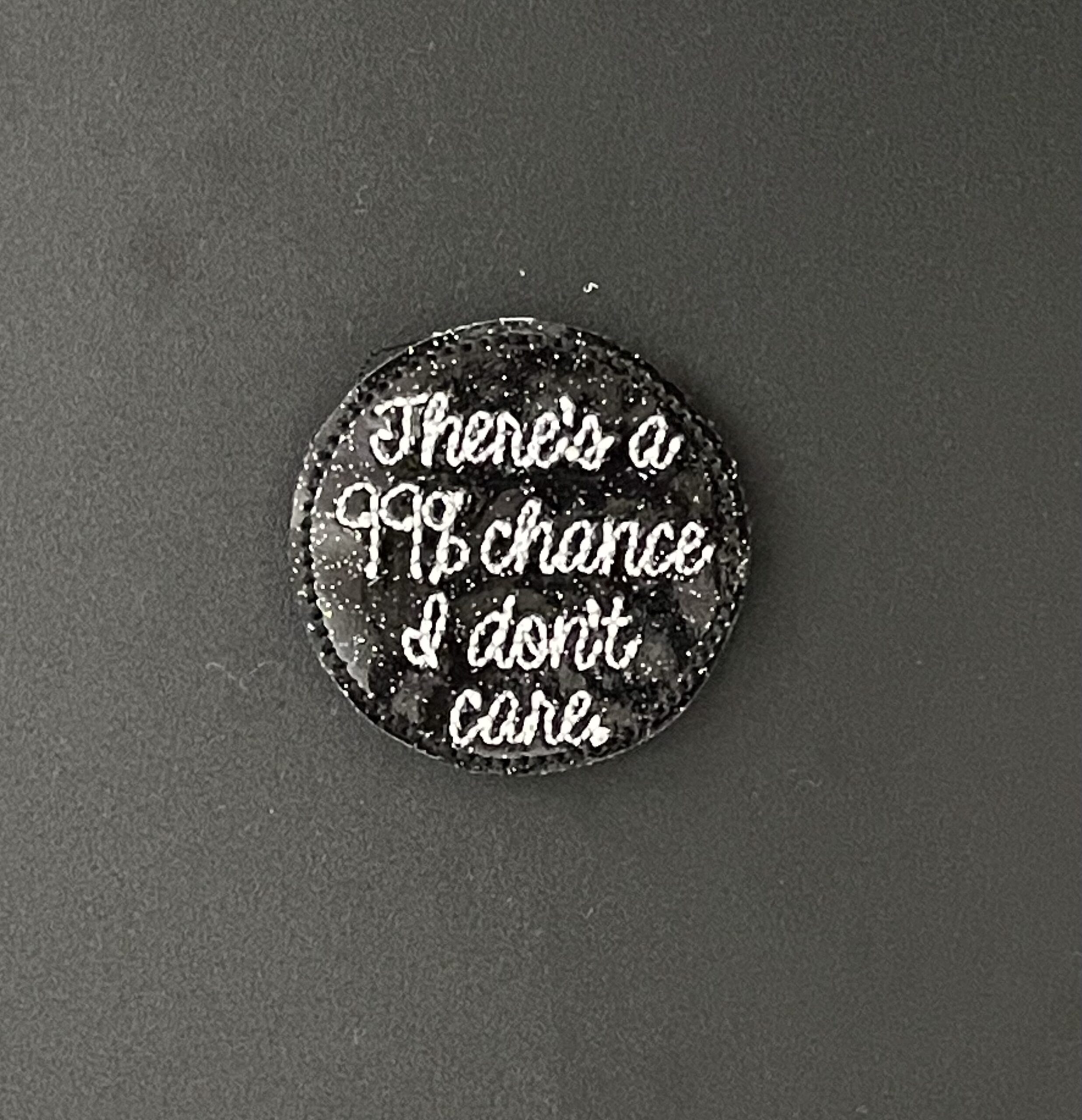 This embroidered appliqué features a “There’s a 99% Chance I Don’t Care” in white on a black glossy background.