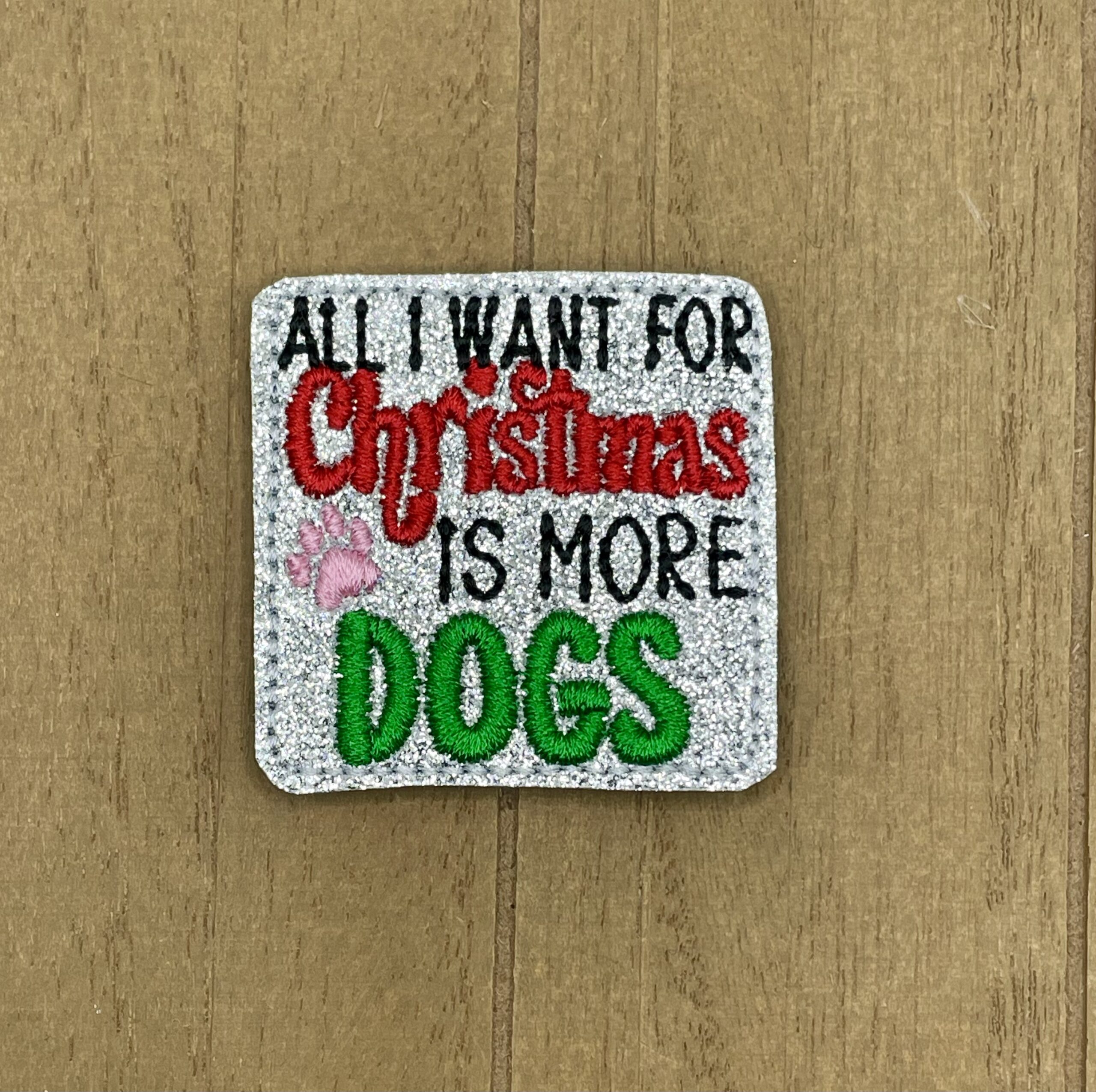 This embroidered appliqué features a paw print and “All I Want For Christmas is More Dogs” on silver glitter.