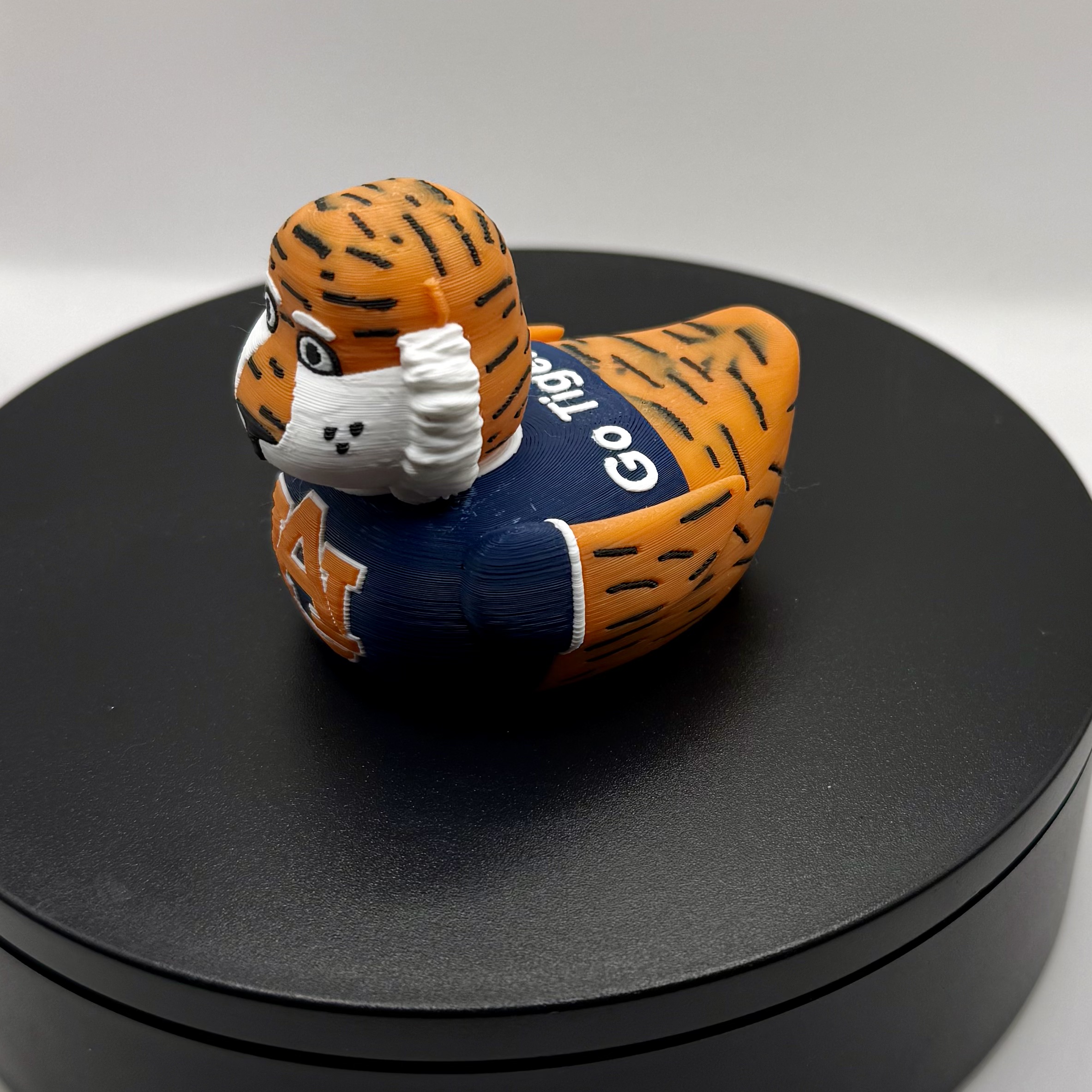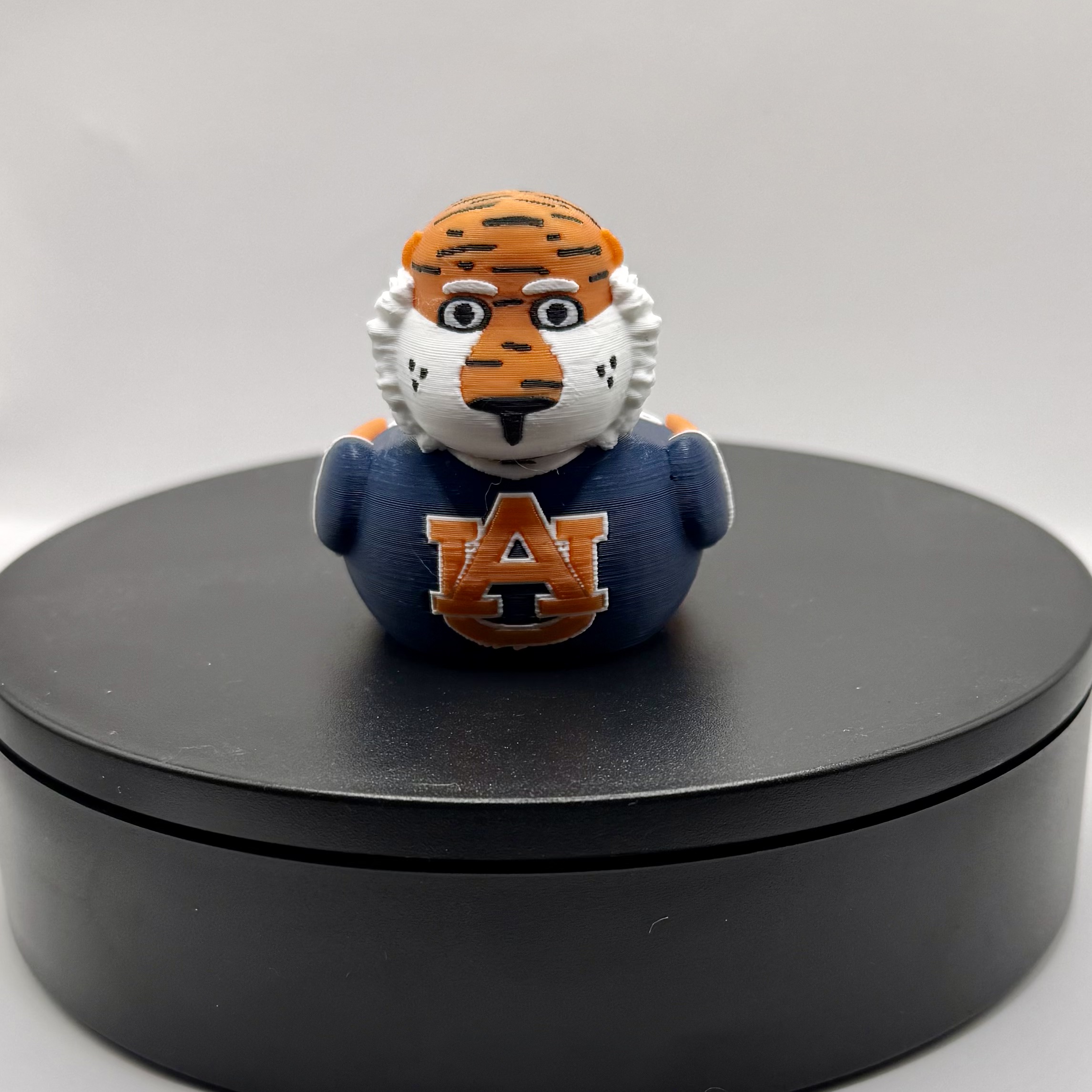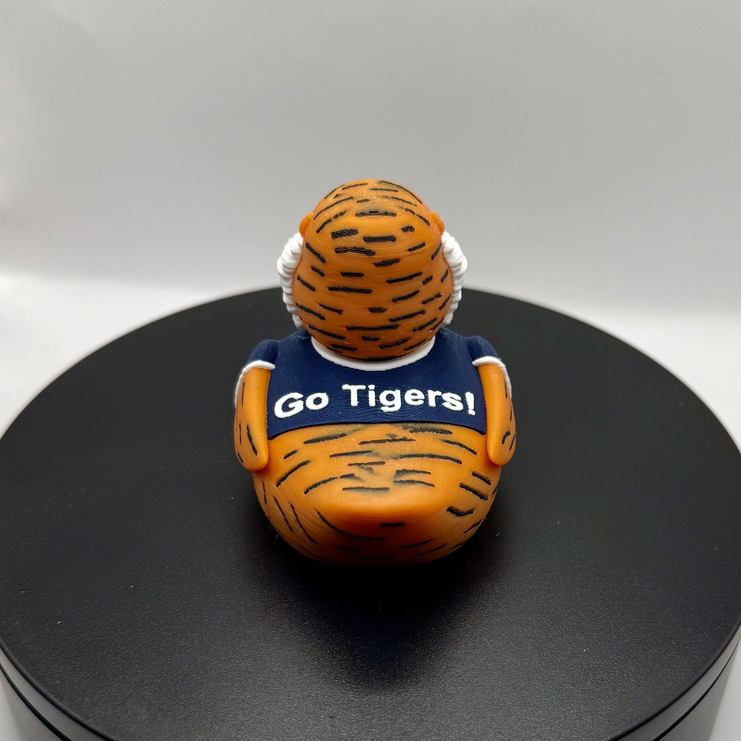 The detailed tiger head features vibrant orange fur with black stripes, a fluffy white mane, expressive eyes, a signature black goatee, and those fierce yet fun tiger markings—topped off with tiny orange ears for maximum mascot energy. Printed in high-quality filament with smooth, layered texture for a tactile, handmade feel, this compact duck is durable, display-ready, and bursting with Auburn spirit.