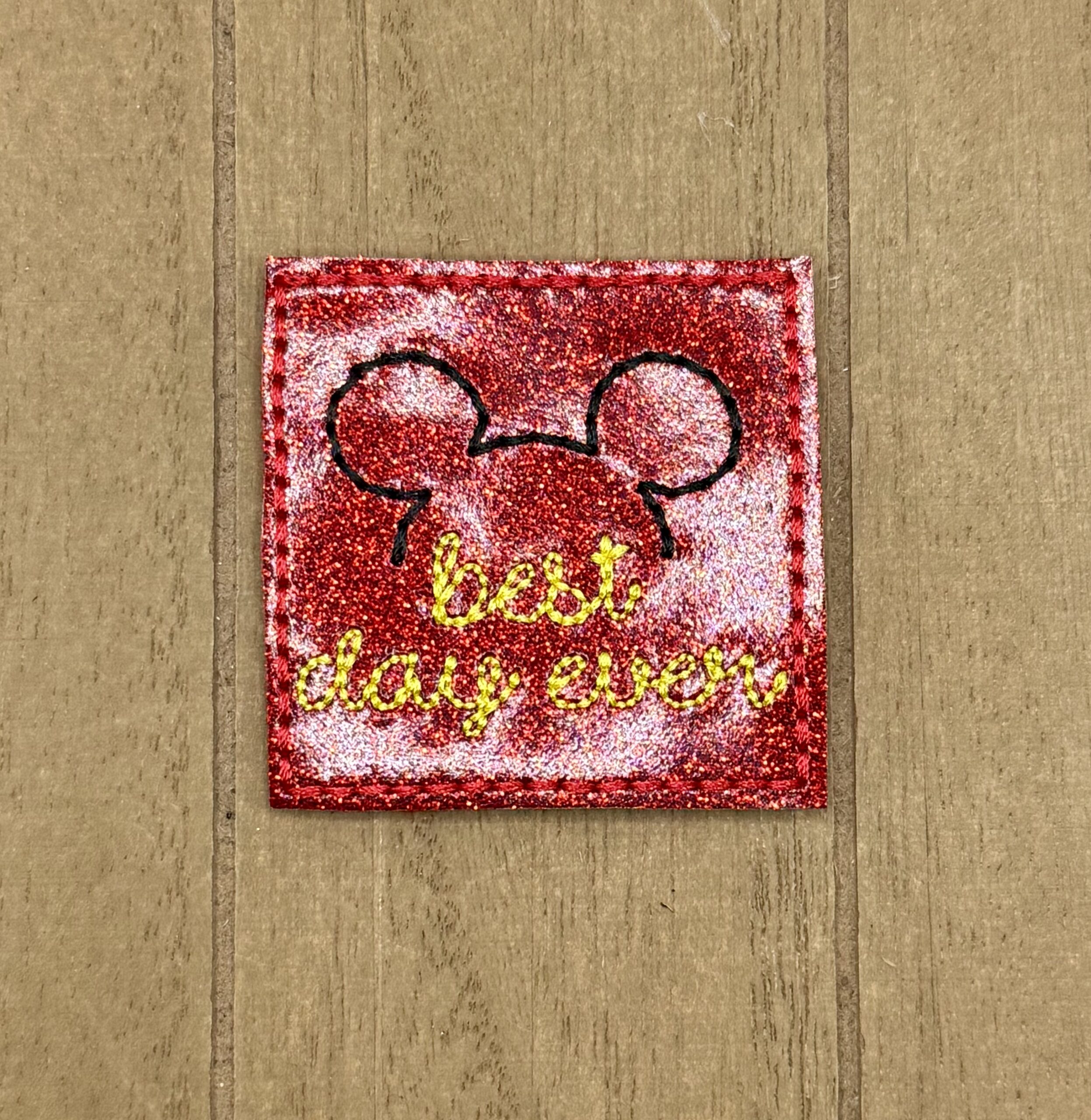 This embroidered appliqué features the famous mouse ears and yellow wording stating “Best Day Ever” on a glittery red material.