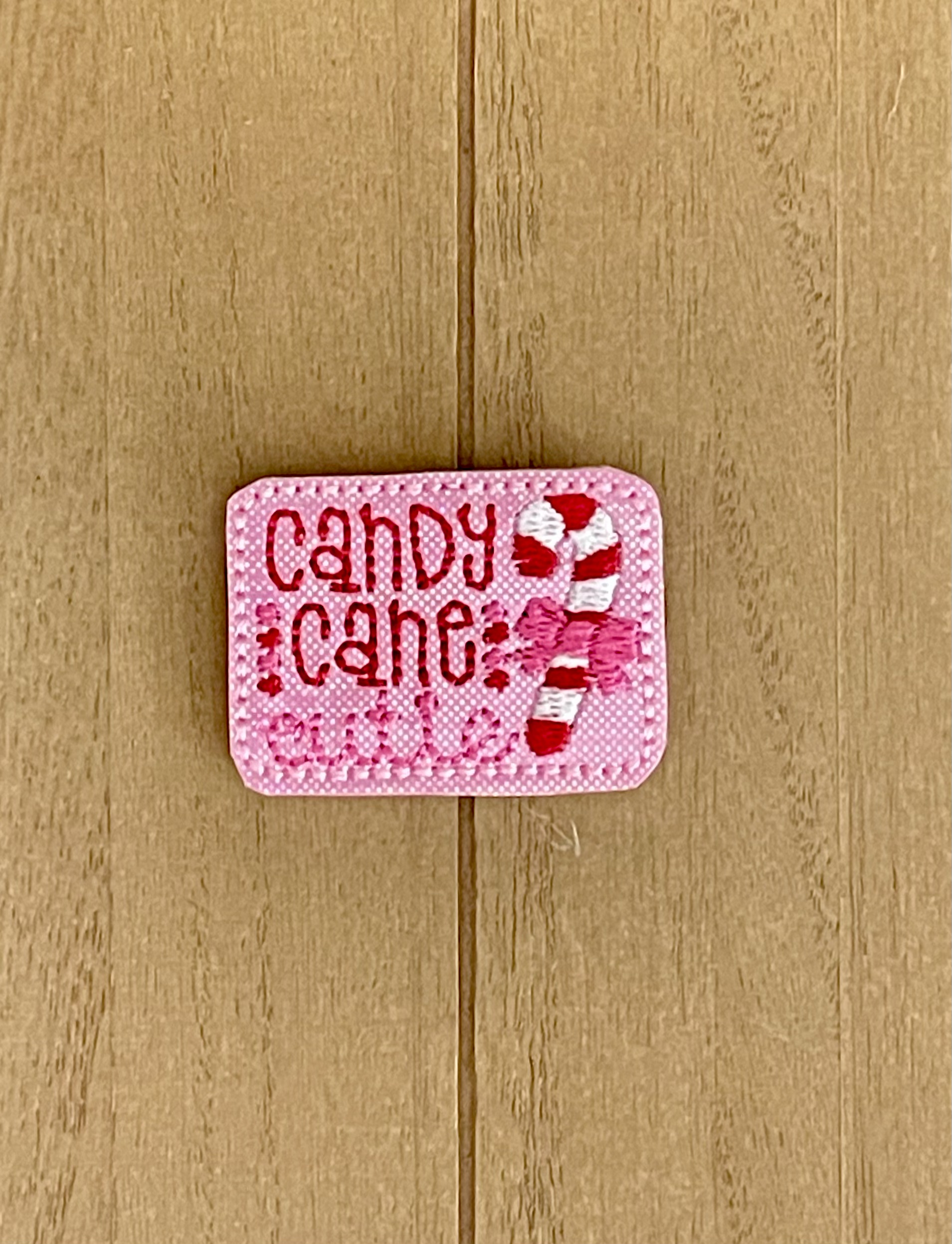 This embroidered appliqué features wording that says “Candy Cane Cutie” on a shimmery pink background with a candy cane accent.