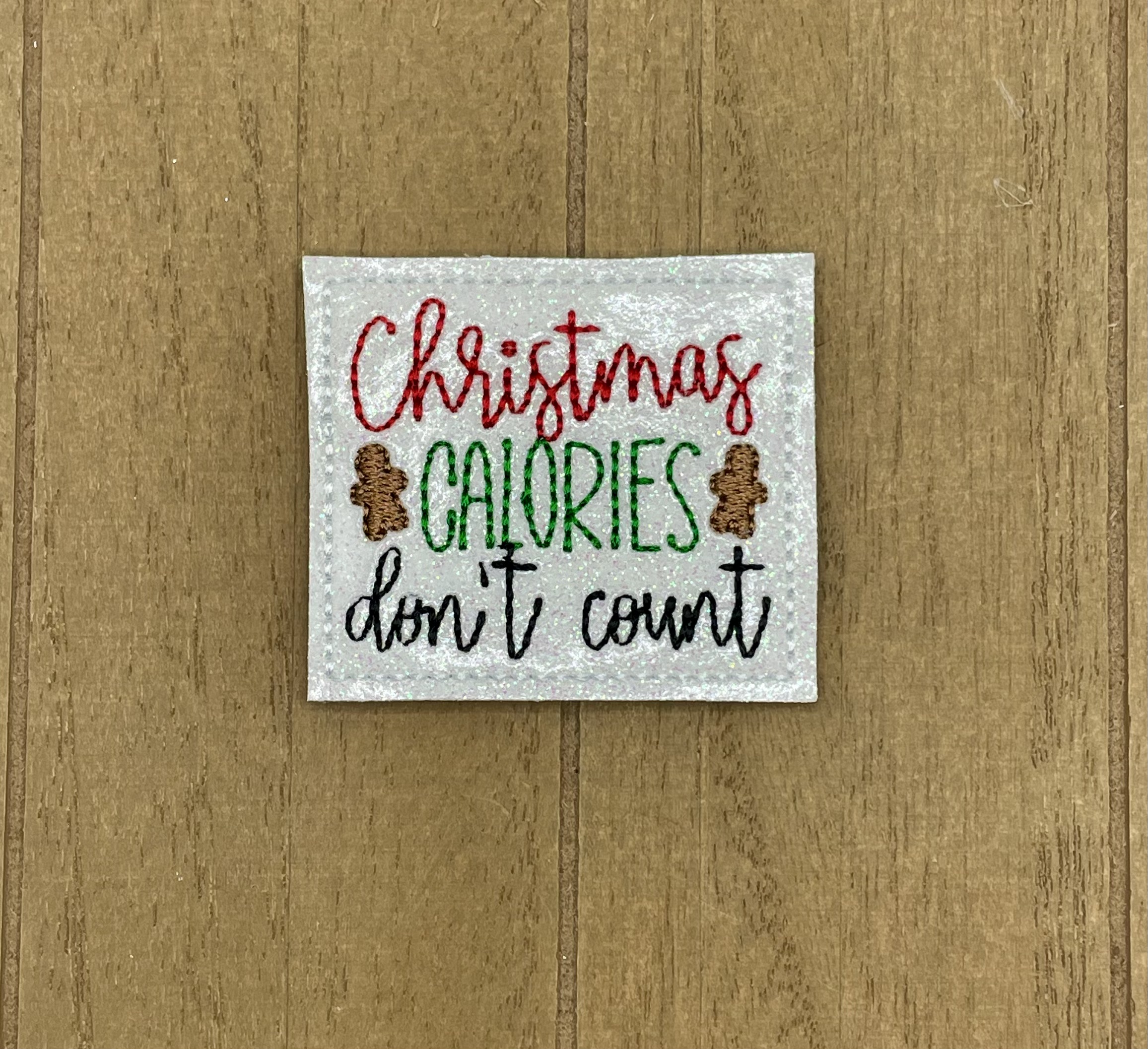 This embroidered appliqué features a “Christmas Calories Don’t Count” on a white shimmery background with 2 gingerbread men accents.