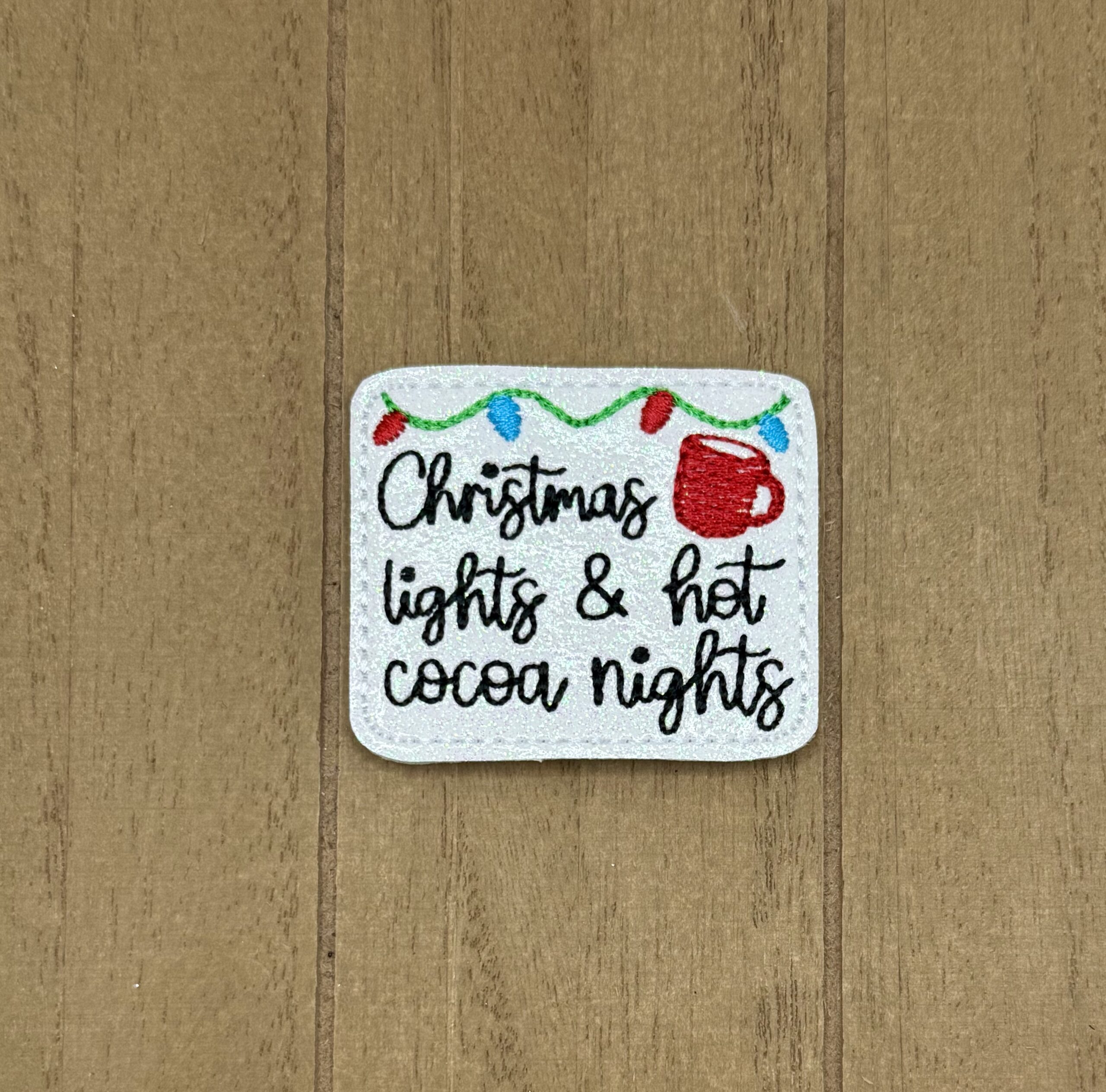 This embroidered appliqué features the saying “Christmas Lights & Hot Cocoa Nights” on a shimmery white material with a string of lights and a mug.