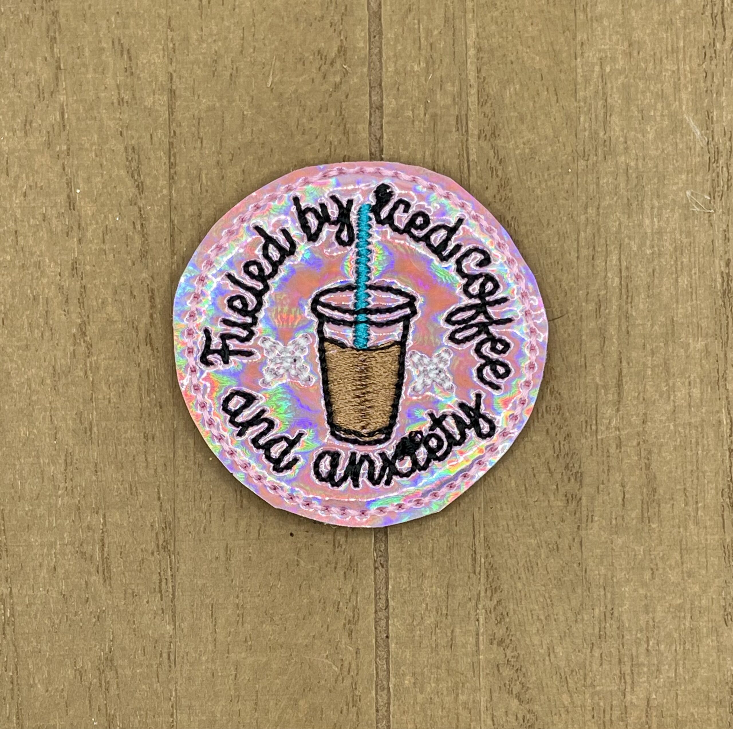 This embroidered appliqué features “Fueled by Iced Coffee and Anxiety” with with an iced coffee on a shimmery pink background.