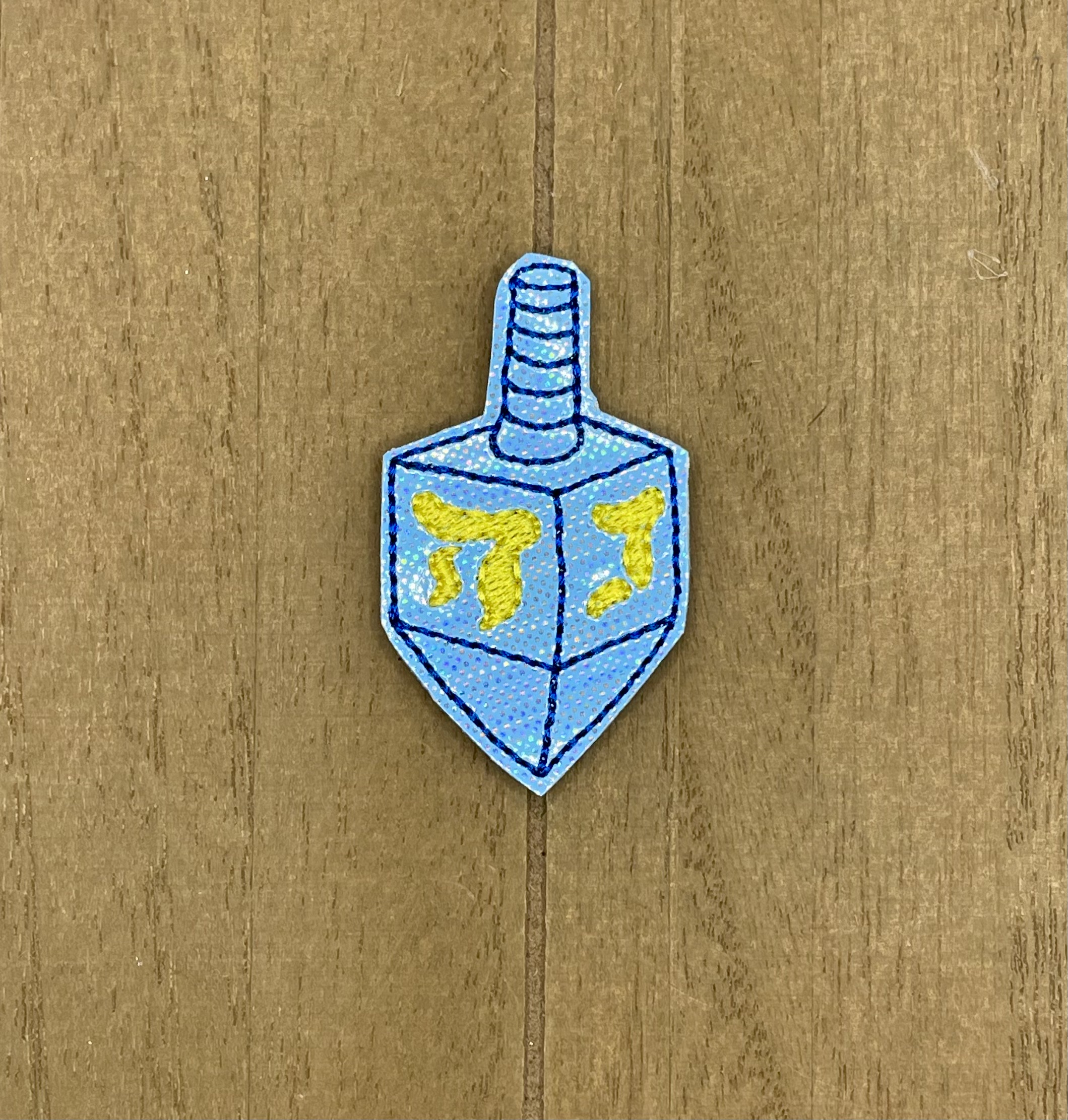 This dreidel shaped embroidered appliqué features blue stitching with Hebrew letters on a glittery blue background.
