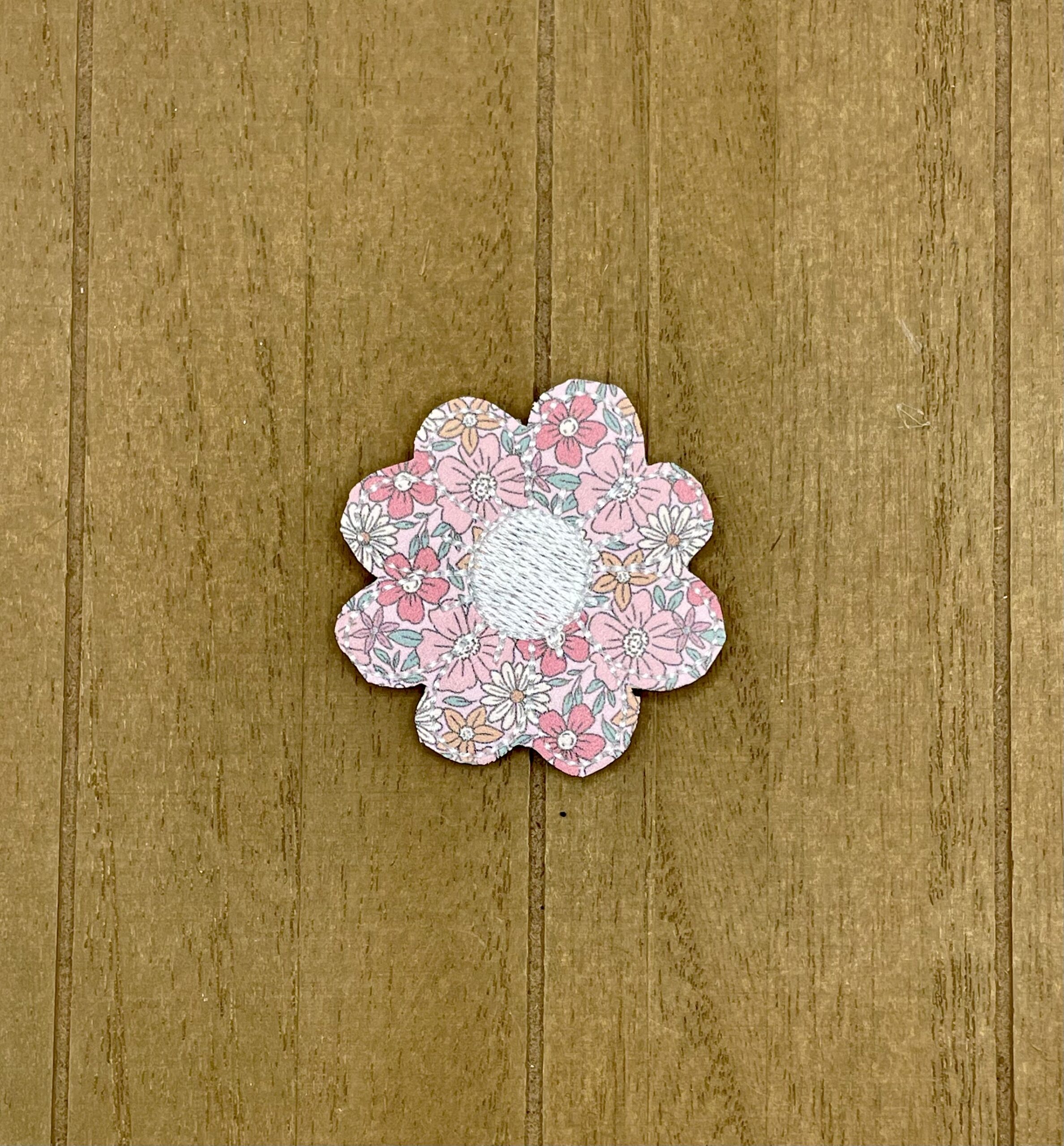 This flower shaped embroidered appliqué features white stitching on a pretty pink floral pattern background.