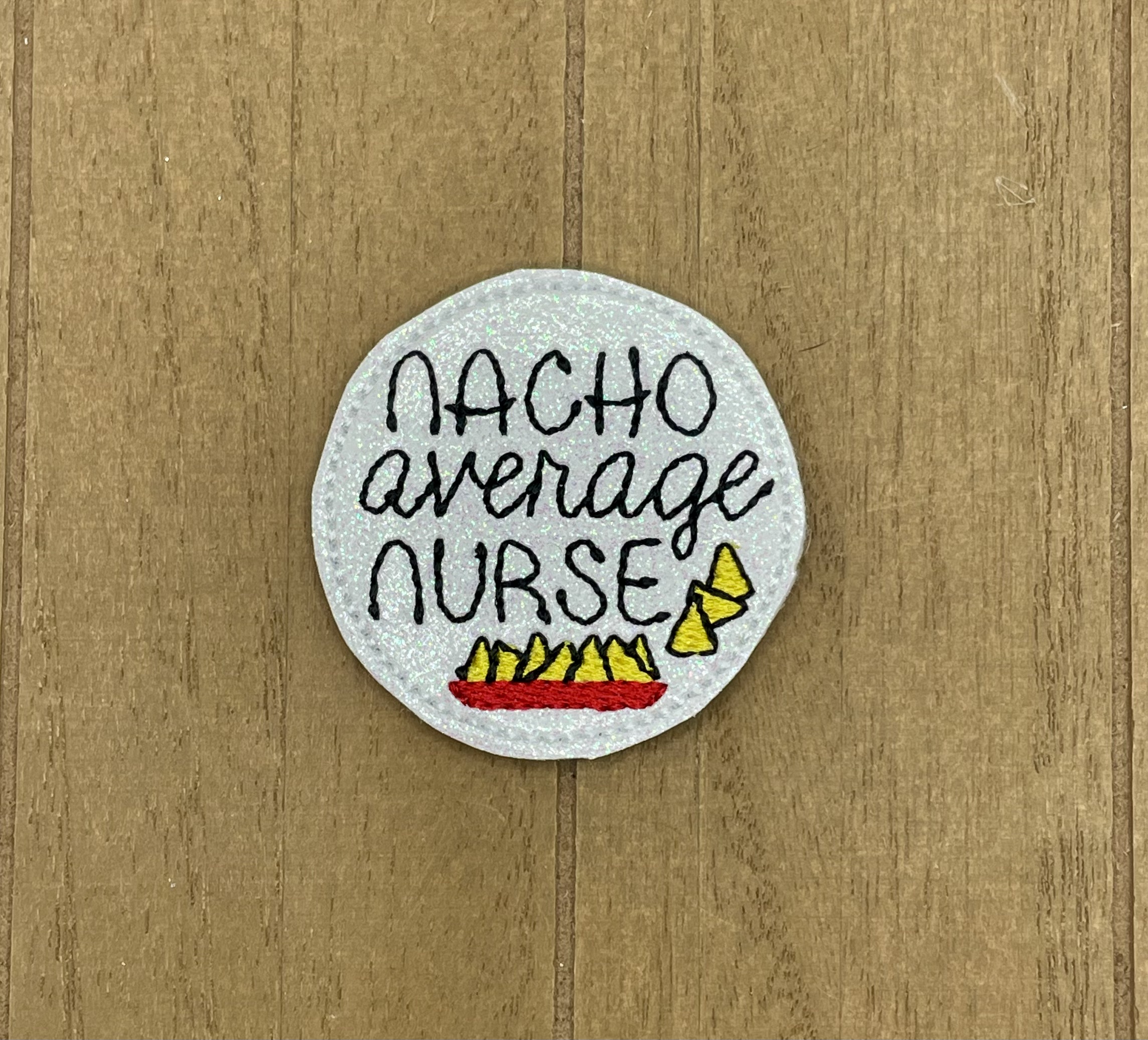 This embroidered appliqué features “Nacho Average Nurse” with a plate of nachos on a shimmery white background.