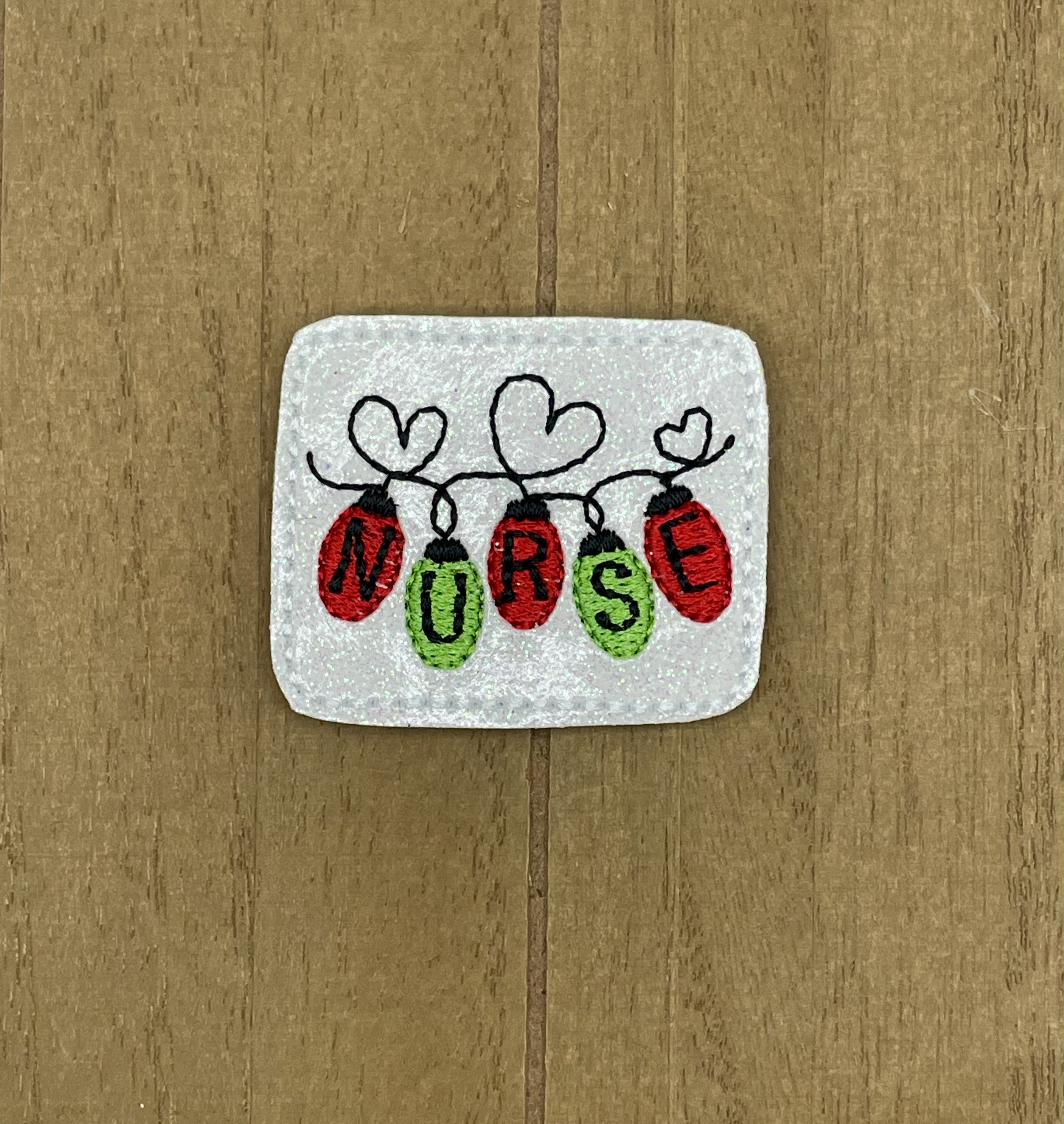 This embroidered appliqué features “Nurse” within red and green Christmas light bulbs on white glitter.
