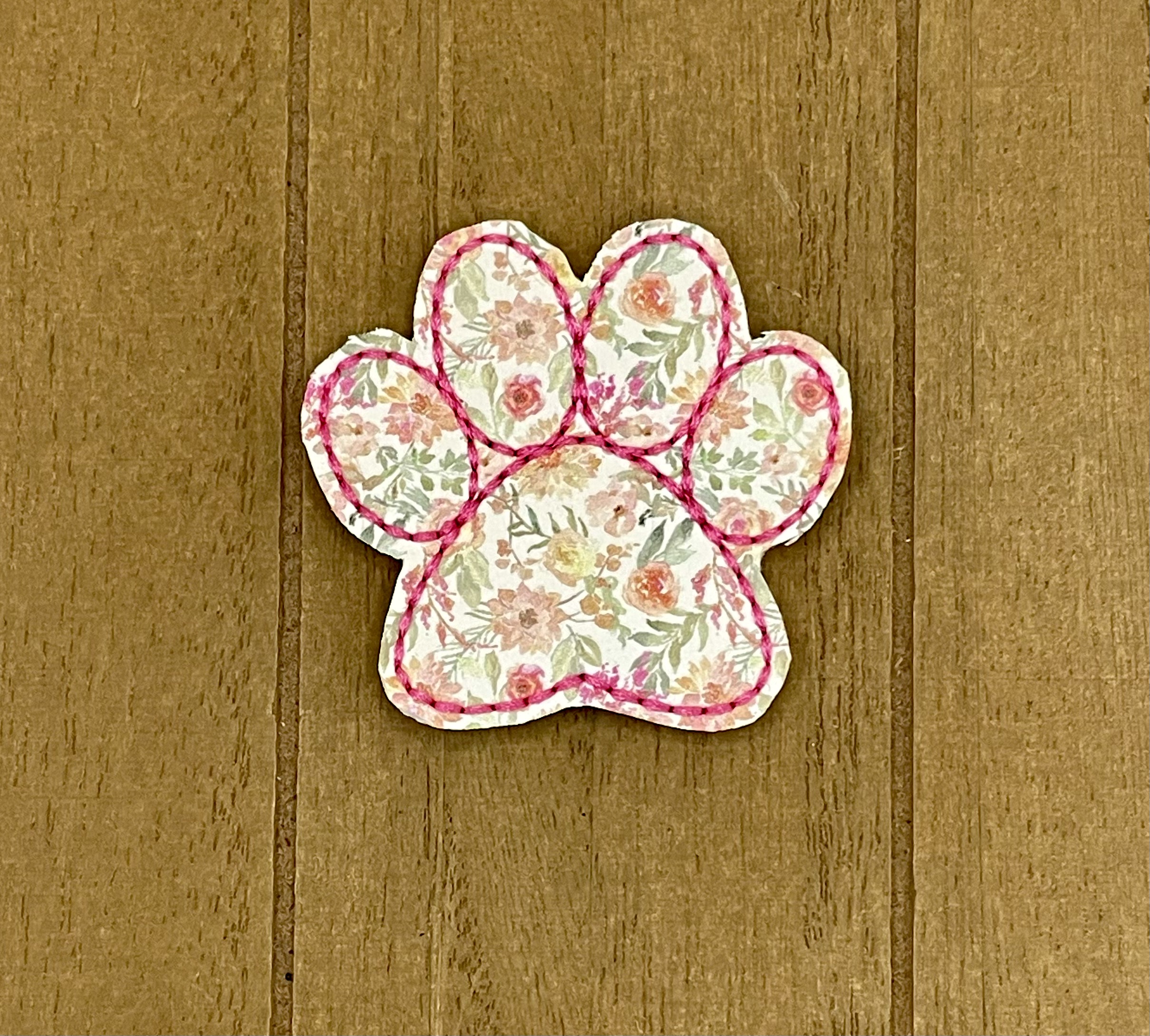 This paw print shaped embroidered appliqué features a pretty pink floral pattern.