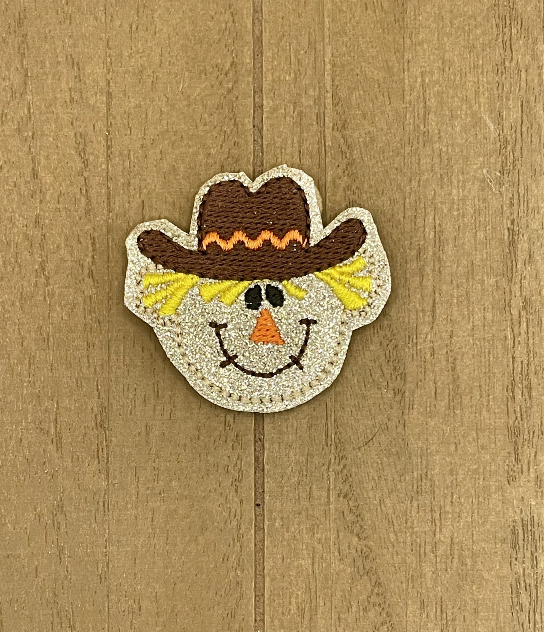 This embroidered appliqué features an adorable scarecrow with a glittery tan background.