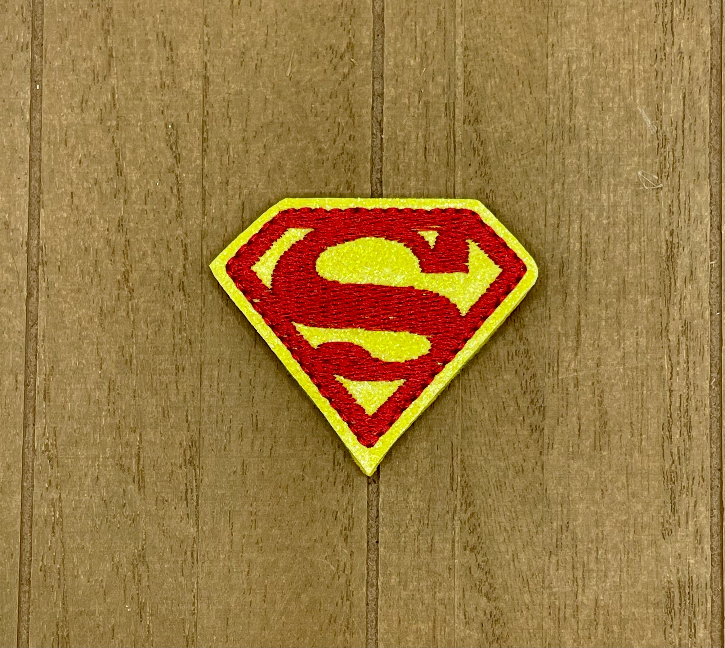 This embroidered appliqué features the logo of a super man on a glittery yellow background.
