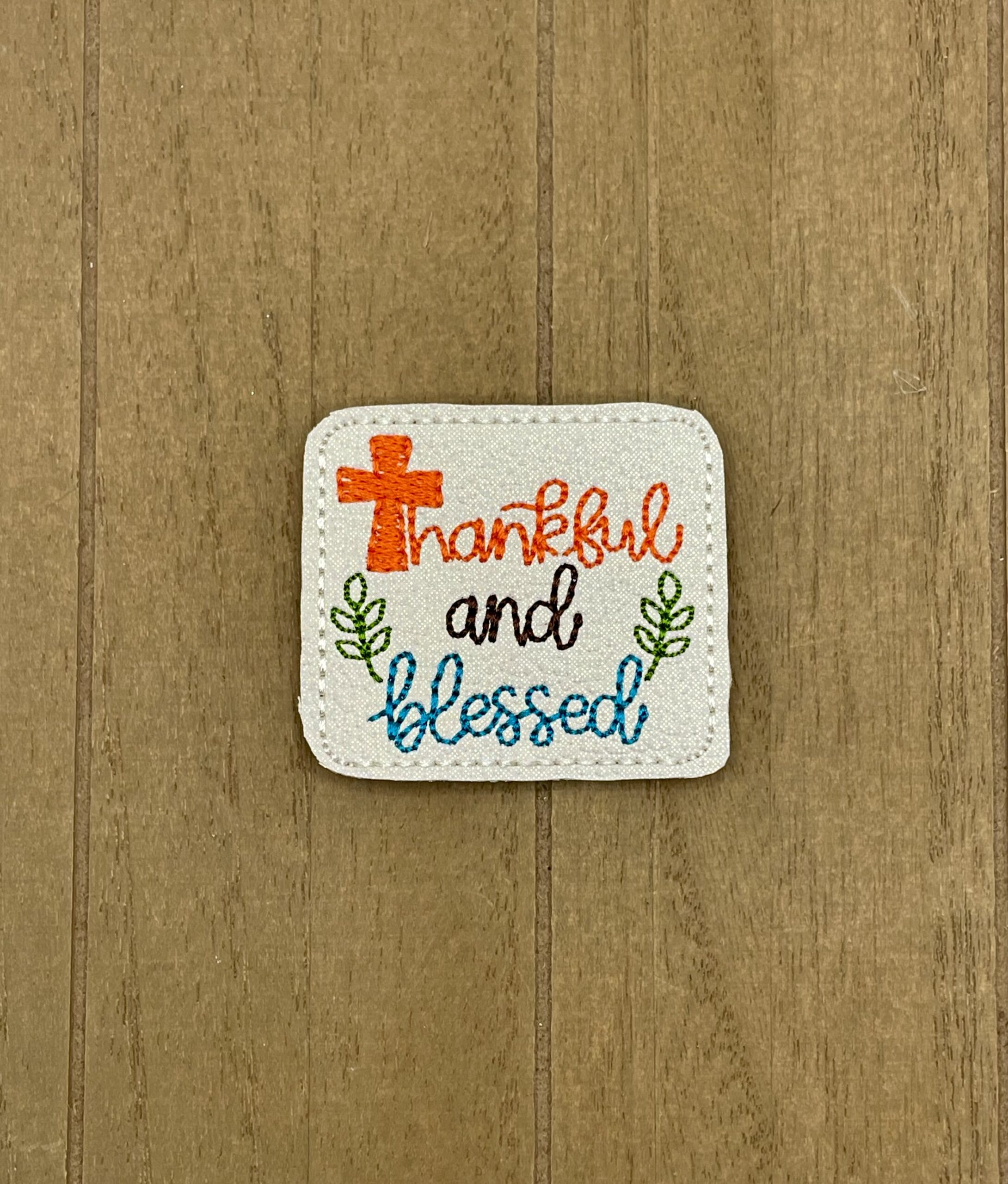 This embroidered appliqué features a cross for the “T” in Thankful on a glittery white background.