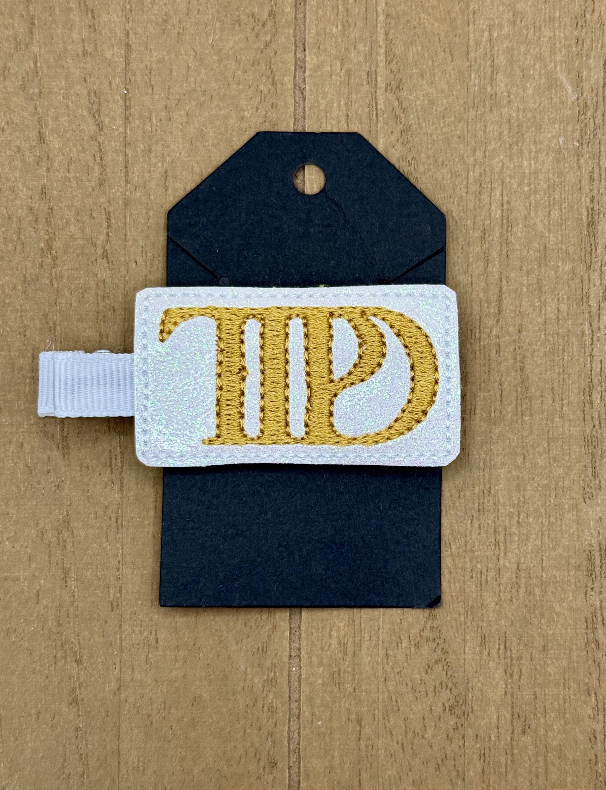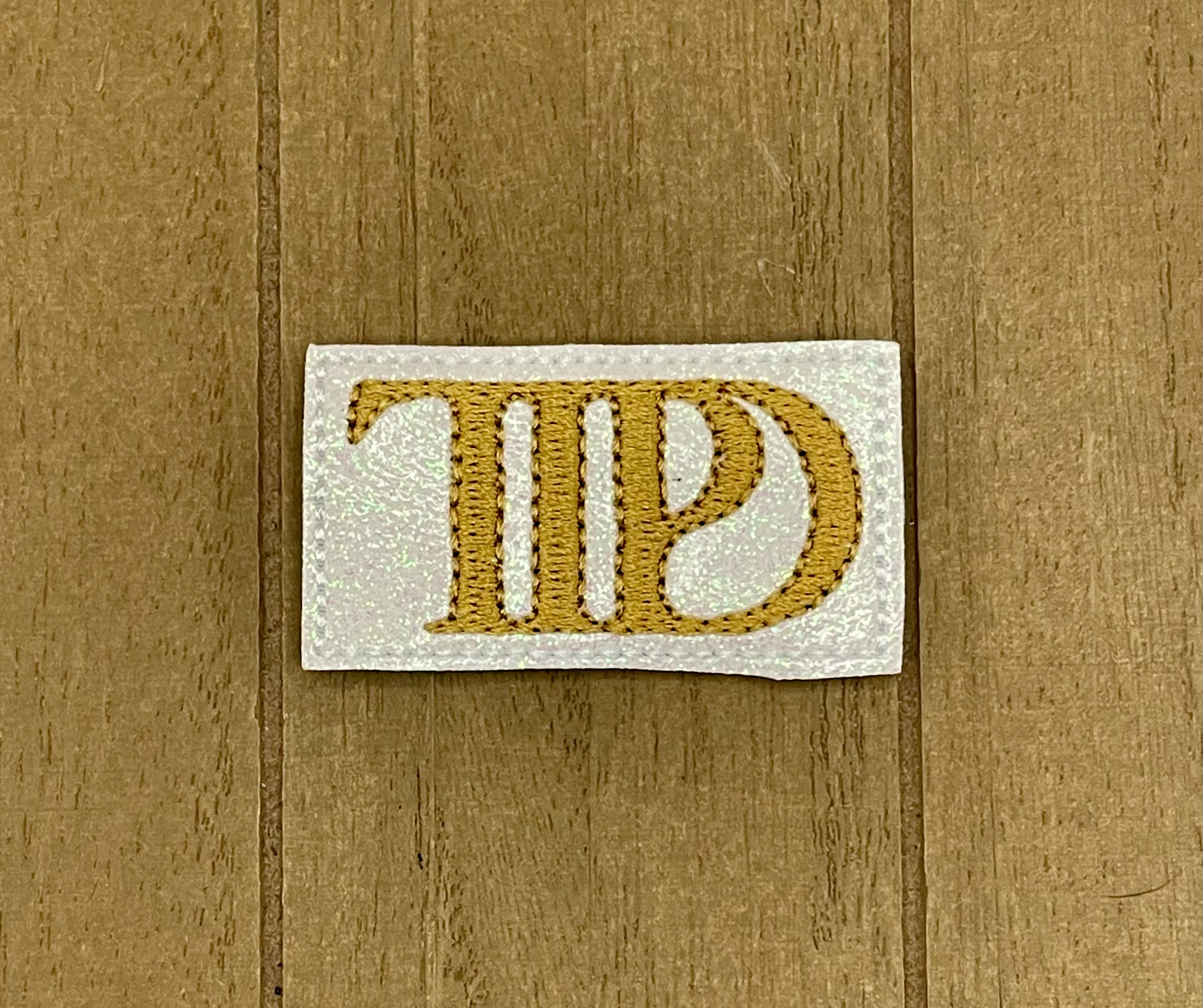 This embroidered appliqué features the logo for Taylor Swift’s album, The Tortured Poets Department on a shimmery white background.