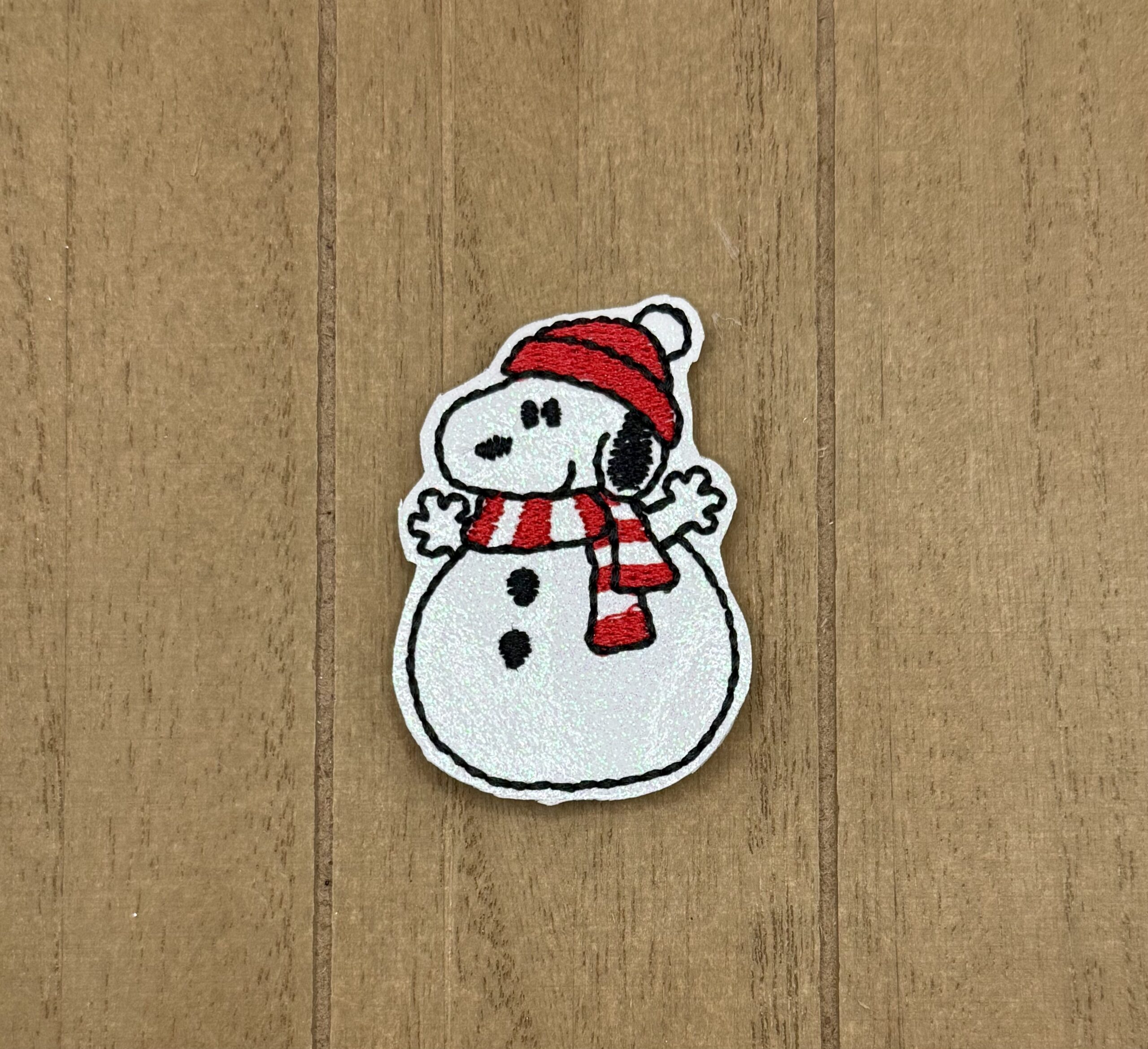 This embroidered appliqué features the famous white beagle as a snowman dressed for winter on a shimmery white material.