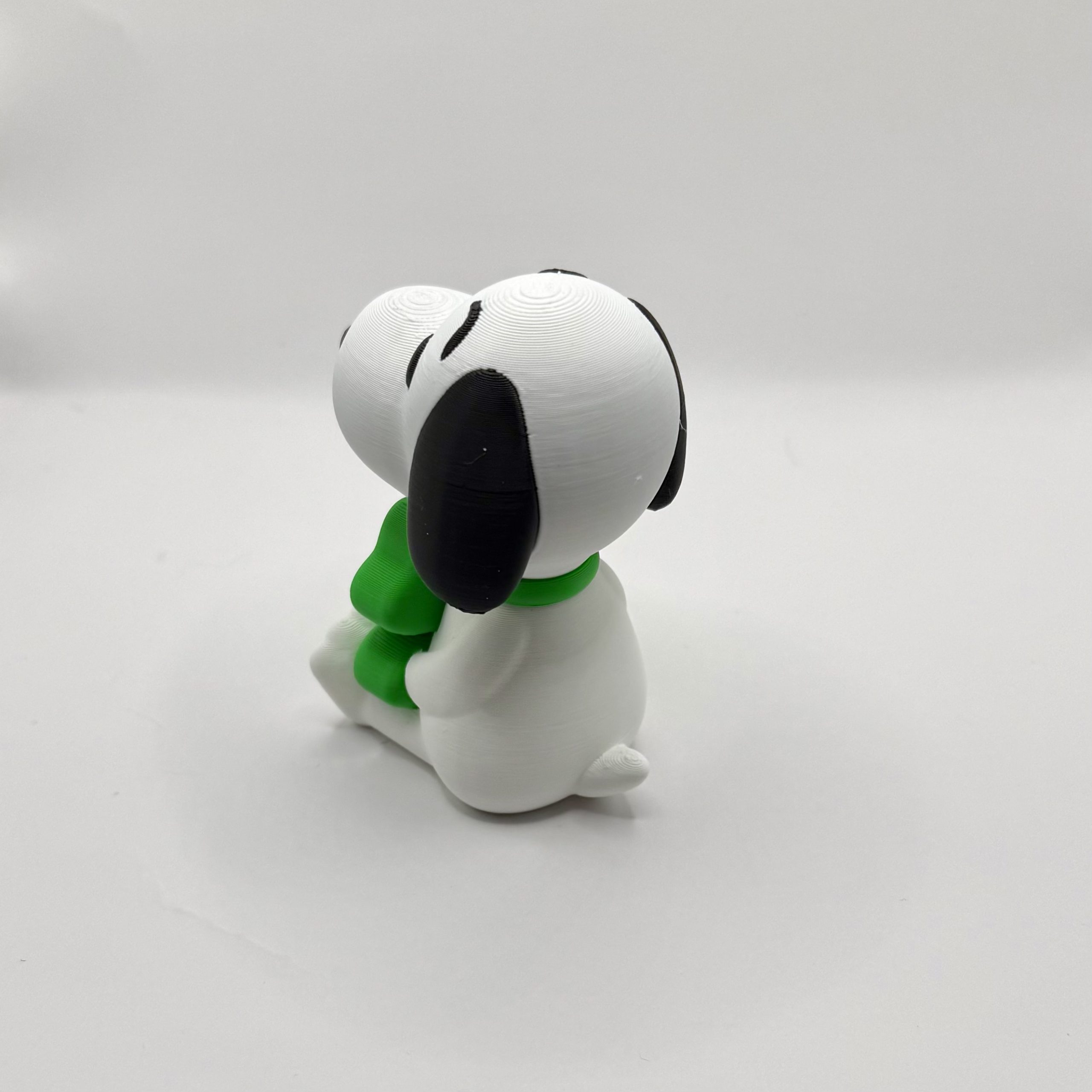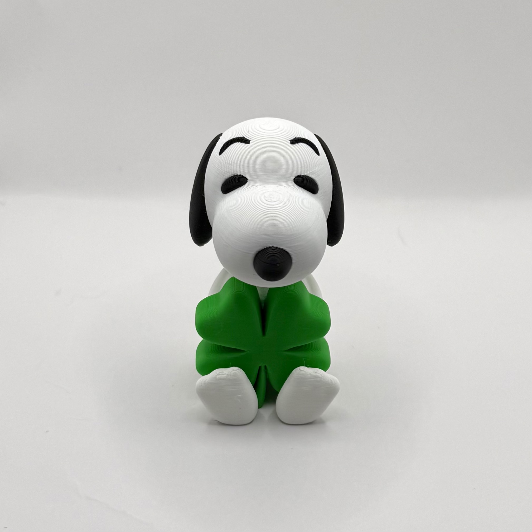 This super cute, handcrafted 3D printed figurine features the iconic endearing white beagle dog with classic black ears, a black nose, and a sweet, content expression (eyes gently closed as if smiling). He’s sitting upright, hugging a vibrant green 4 leaf clover close to his chest with his little paws – the ultimate symbol of Irish Pride!