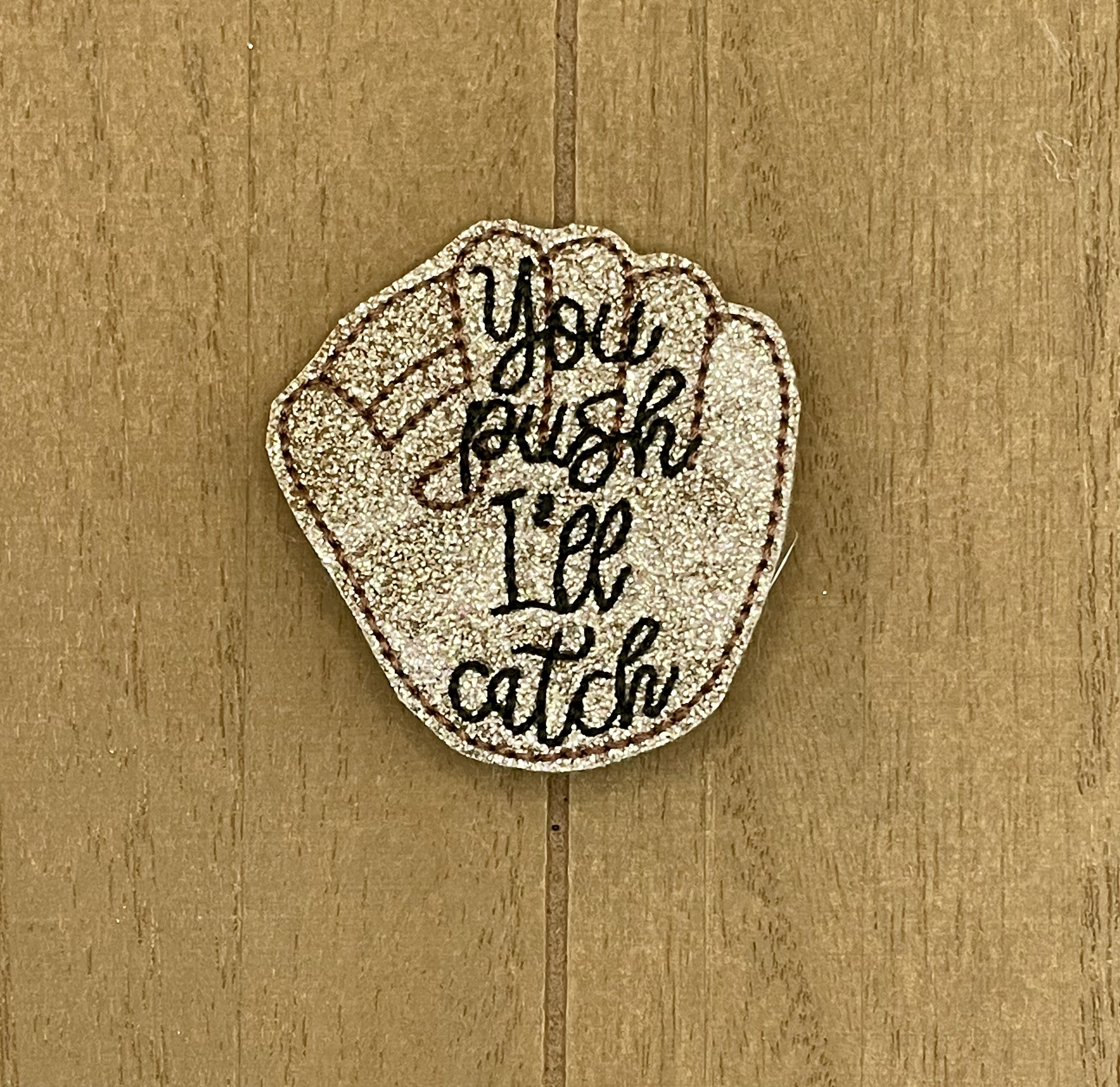 This baseball glove shaped embroidered appliqué features “You Push, I’ll Catch” for the Labor and Delivery Department!